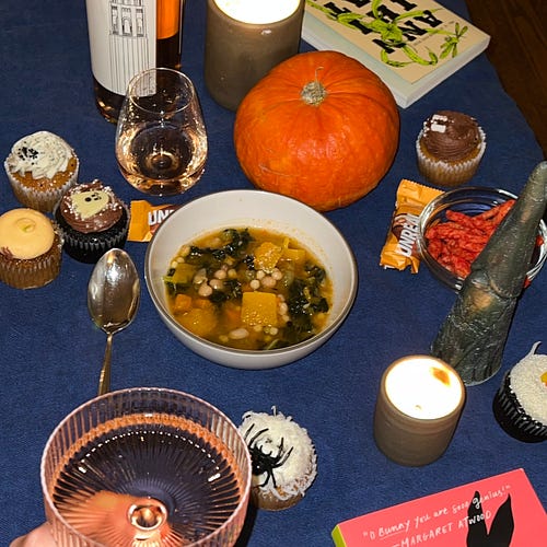 Please I need to know, what are your Halloween costumes from birth to present day? And if you have photos pleeease share and let us cherish your creativity. Hiii friends, welcome to our first monthly Dinner Party! Jump into the discussion :) Today’s dinner party is full of Autumn minestrone, Halloween cupcakes, dry rosé and candy and snacks. Playing in the background is Hocus Pocus for our nostalgic pleasure. HAPPY HALLOWEEN.